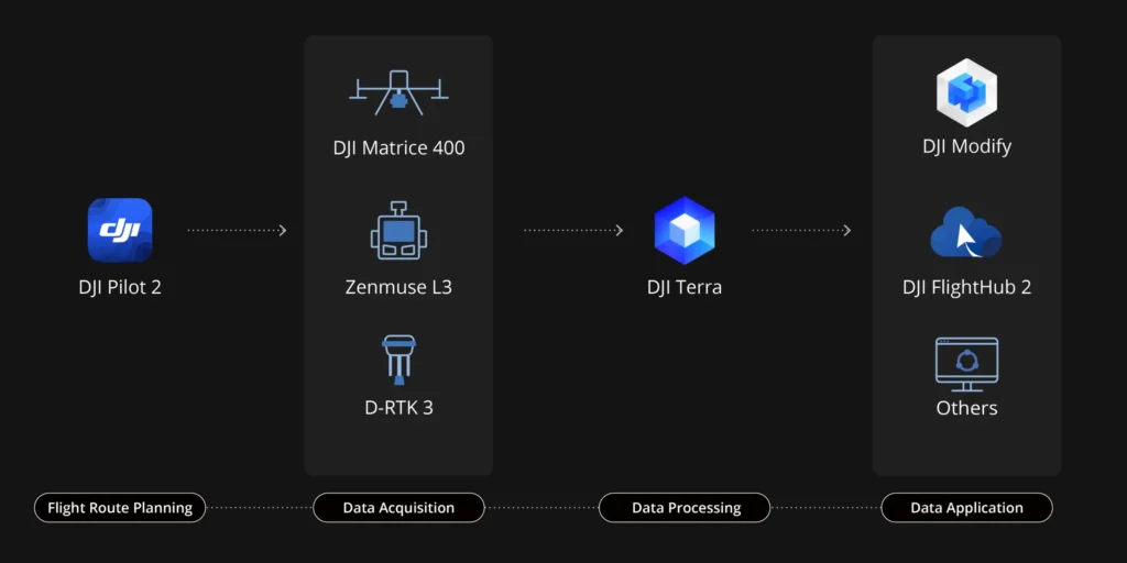 Zenmuse L3 seamlessly integrates with DJI’s ecosystem to deliver an end-to-end mapping solution. From data acquisition and processing to application, this unified workflow is simpler to operate and easier to master than traditional multi-platform setups, helping users efficiently complete a wide range of mapping tasks.