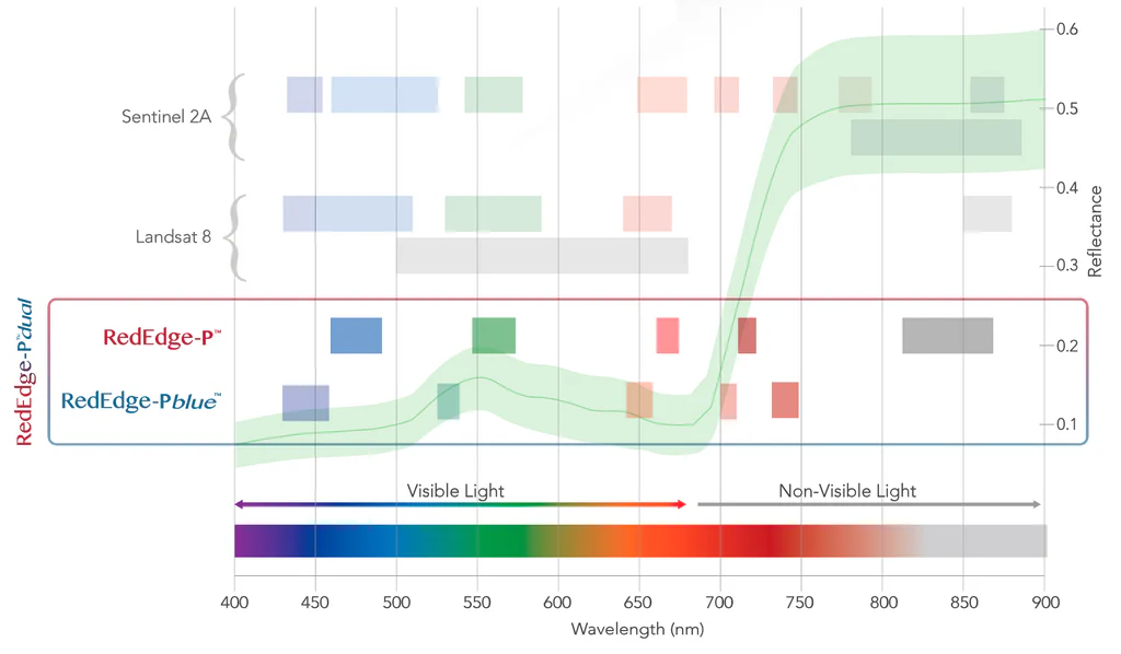 The RedEdge-P dual bands cover Landsat 8 and Sentinel-2 satellite bands (~10 m / 32 ft per pixel) at an enhanced spatial resolution of 2 cm / 0.8 in. It enables the use of many indices already created using satellites.