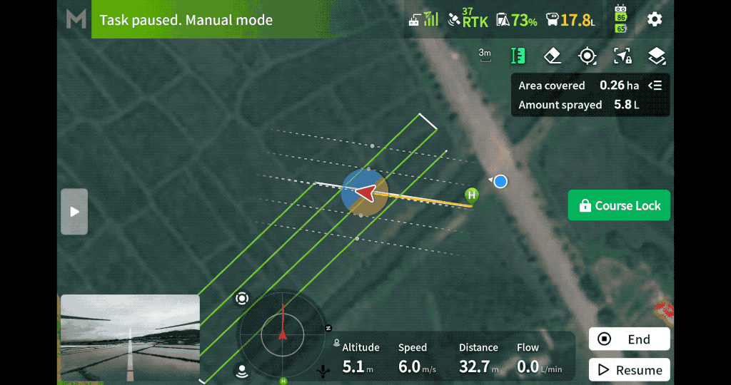 - Large plots: Operators can manually spray field boundaries and then switch to automatic mode to complete the remaining area with consistent coverage.