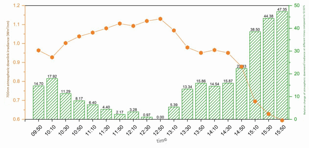 The measured results show that even at noon on a clear day, the downlight irradiance may still vary by more than 10% within 30 minutes due to changes in the solar altitude angle. The lighting environment in cloudy weather will fluctuate significantly. Ignoring these changes will seriously affect the accuracy of radiation measurement based on the gray-plate transfer method, resulting in a lack of consistency in the time series of the data.