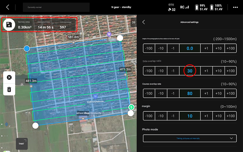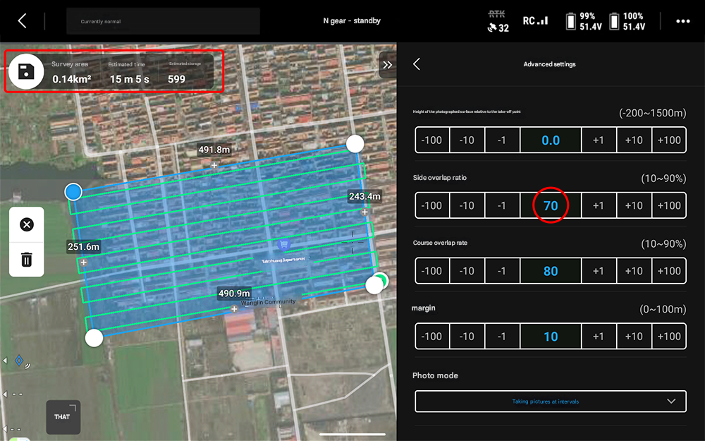 (2) The push-broom mode camera is three-axis stabilized to the ground, which is suitable for large-area aerial photography operations. In the route mode, it automatically flies and collects data while flying. The operating efficiency is more than 5 times higher than that of hovering sweeping.