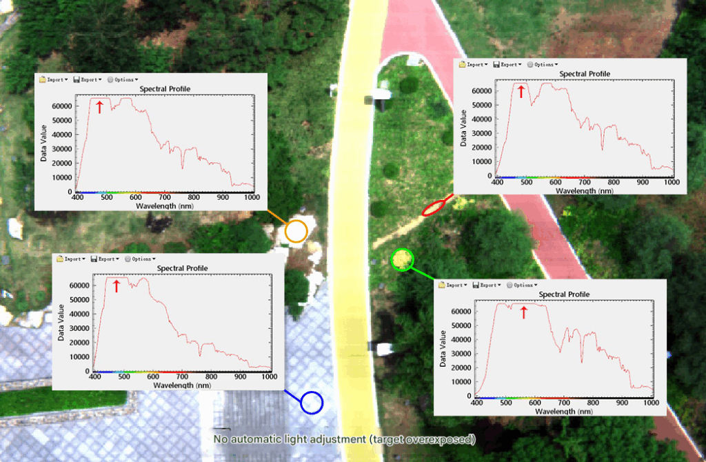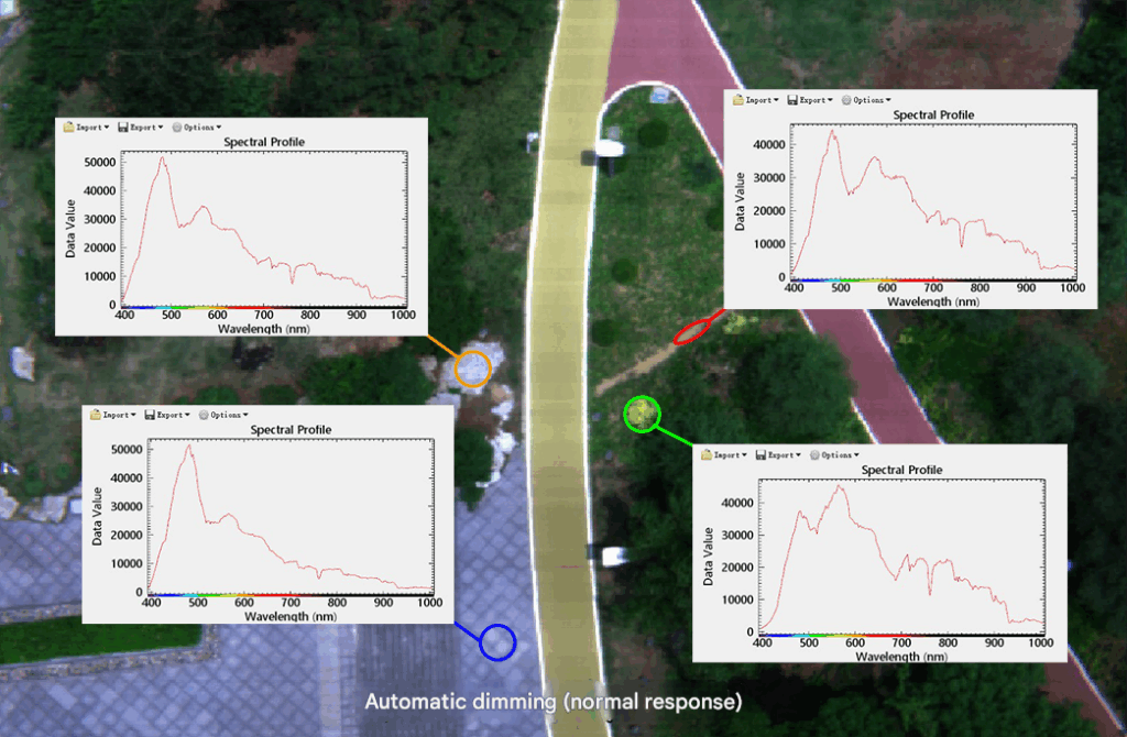 The optimal combination of full field of view, full-band gain, and integration time is achieved within milliseconds, enabling the camera to perform high signal-to-noise ratio spectral imaging in the best condition. This eliminates the need for tedious operations such as pre-flight metering and relying on experience to set fixed exposure parameters, ensuring that targets in complex scenes are not too dark or overexposed, essentially improving data quality.