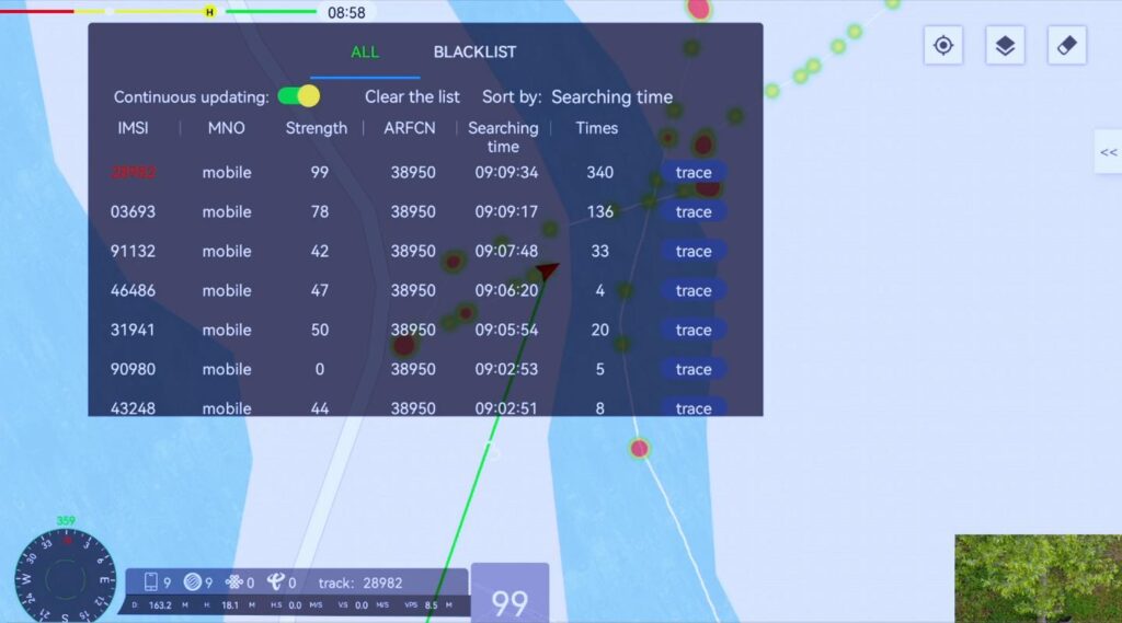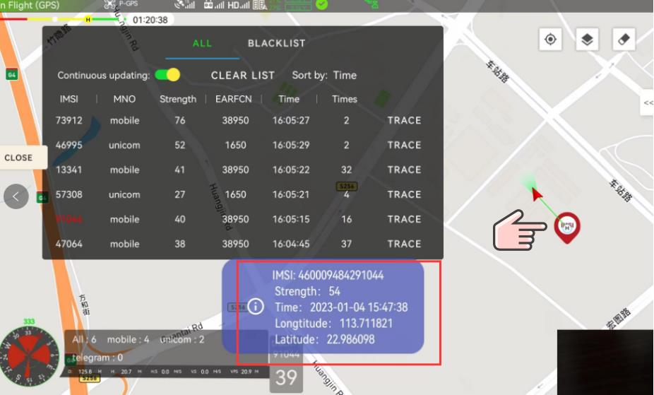 Seamlessly integrated with the DJI drone’s data transmission system, the airborne IMSI Catcher ensures uninterrupted operation within a radius of up to 8km (CE/SRRC/MIC) / 20 km (FCC)*. The software application (APP) runs on the drone’s remote controller or an Android tablet, logging all detected data with GPS and timestamping for post-mission analysis.