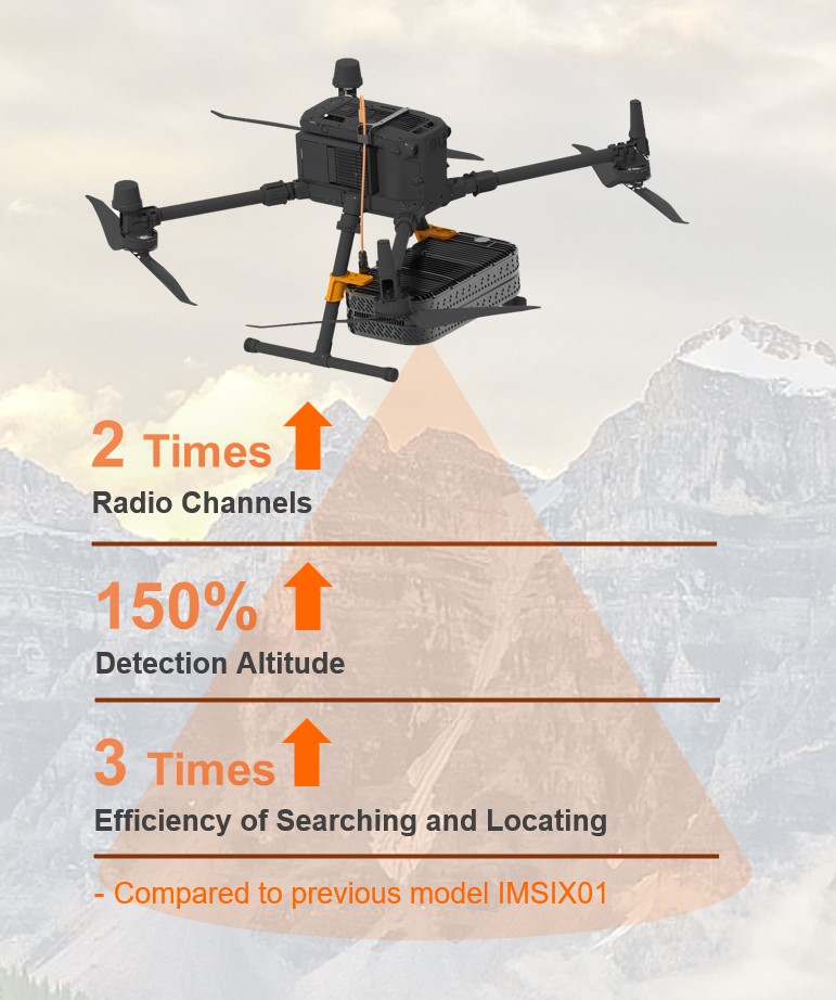 IMSIX02 is an advanced airborne cellular intelligence solution built on the DJI M350 RTK. It can search, track, and locate mobile phones by identifying their IMSI numbers. Compared to its predecessor, IMSIX01, it offers three times higher search and locating efficiency and a 50% increase in detection altitude. Additionally, its enhanced automatic sensing of public networks and auto-configuration of network parameters significantly improve ease of use for mission operators.