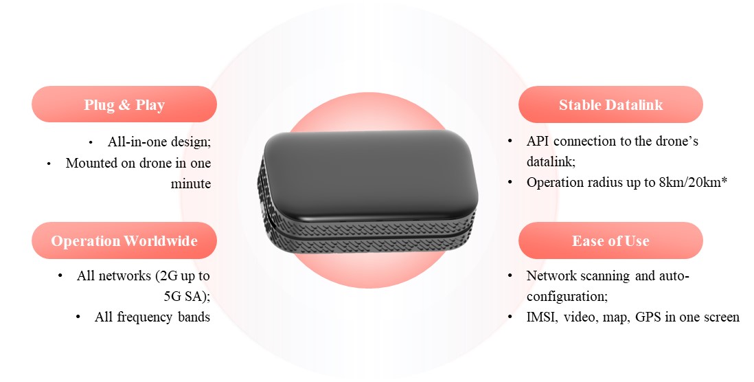 The IMSI Catcher, powered by software-defined radio, supports multiple telecommunication standards, including GSM (2G), WCDMA (3G), LTE (4G), 5G NSA, and 5G SA, ensuring adaptability to network evolution over the next decade. Designed as a highly integrated, plug-and-play system, it can be mounted on the drone within a minute, enabling rapid deployment without the need for time-consuming installation or complex calibration procedures.